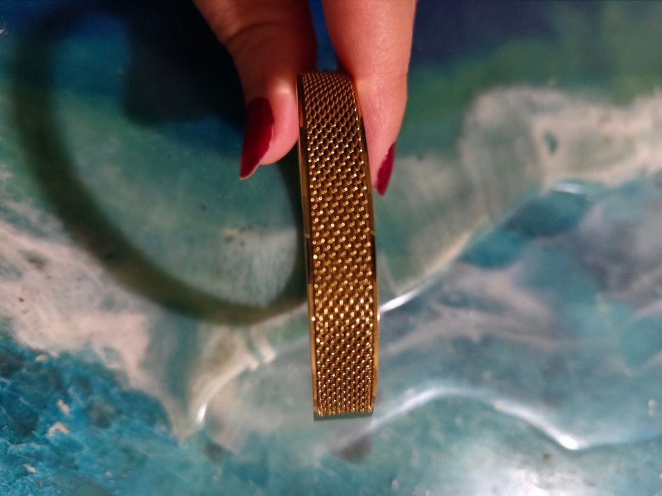 Parlak altın renkli, dokulu tasarıma sahip kadın çelik bilekliği, şıklık katar.✨