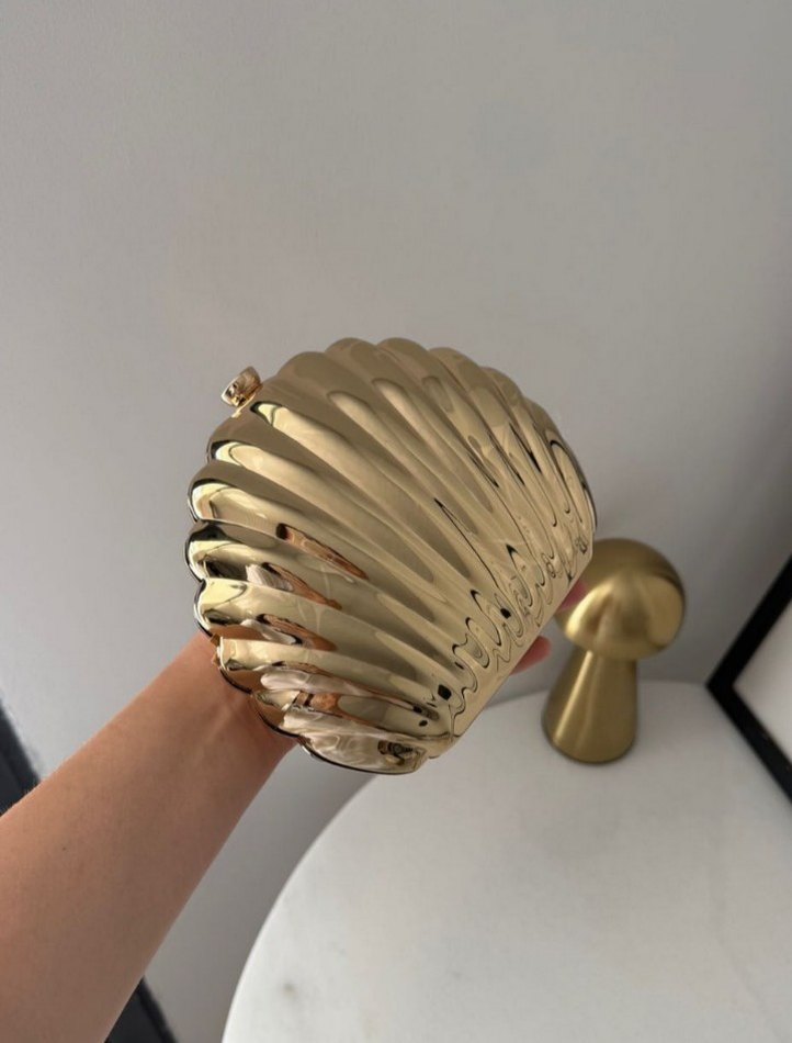 Pilise detaylı parlak altın metalden yapılmış bohem tarzda kadın clutch çanta, günlük kullanım için uygundur. Desensiz yüzeyi şık bir dokunuş sağlar. ✨