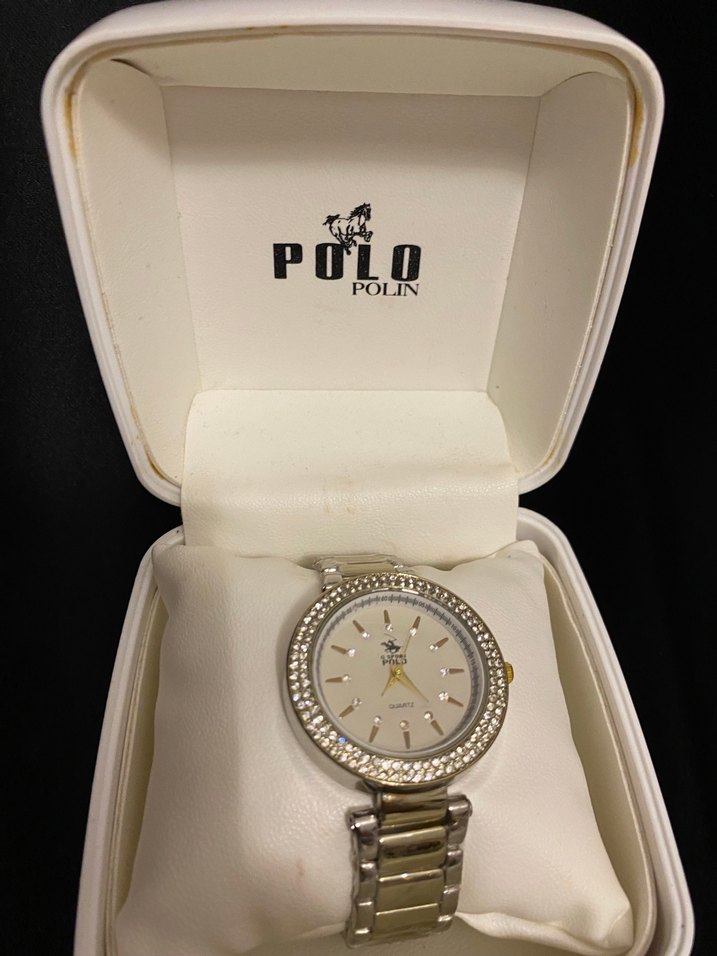 Parlak altın renkli, kemerli tasarıma sahip modern klasik kadın kol saati. Çevresi küçük kristallerle süslenmiştir. Polo Polin kutusunda sunulur. ⌚