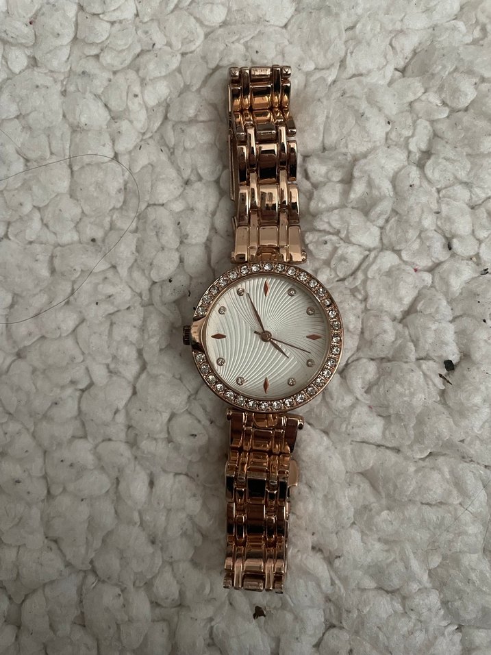Parlak altın kaplama ve kemer detaylı kadın saati. Yuvarlak kadranı çevreleyen küçük kristallerle klasik şıklığı modern tarzla buluşturur. ⌚