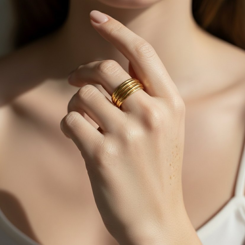Parlak altın renkte, desen içermeyen minimalist ve çağdaş tarzda kadın yüzüğü. Günlük kullanıma uygun, zahmetsiz şıklık ve klasik zarafet sunar.