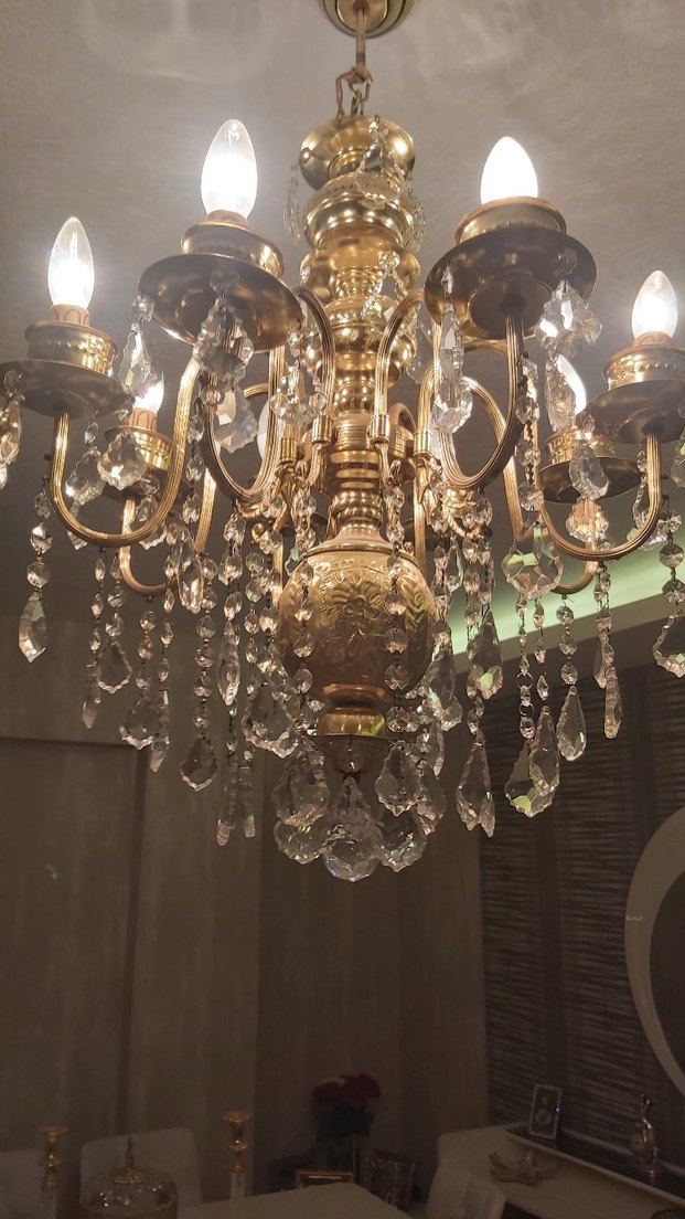 Kristal detaylı, çoklu ampullü parlak altın avize, şık bir atmosfer yaratır. pirinctir.