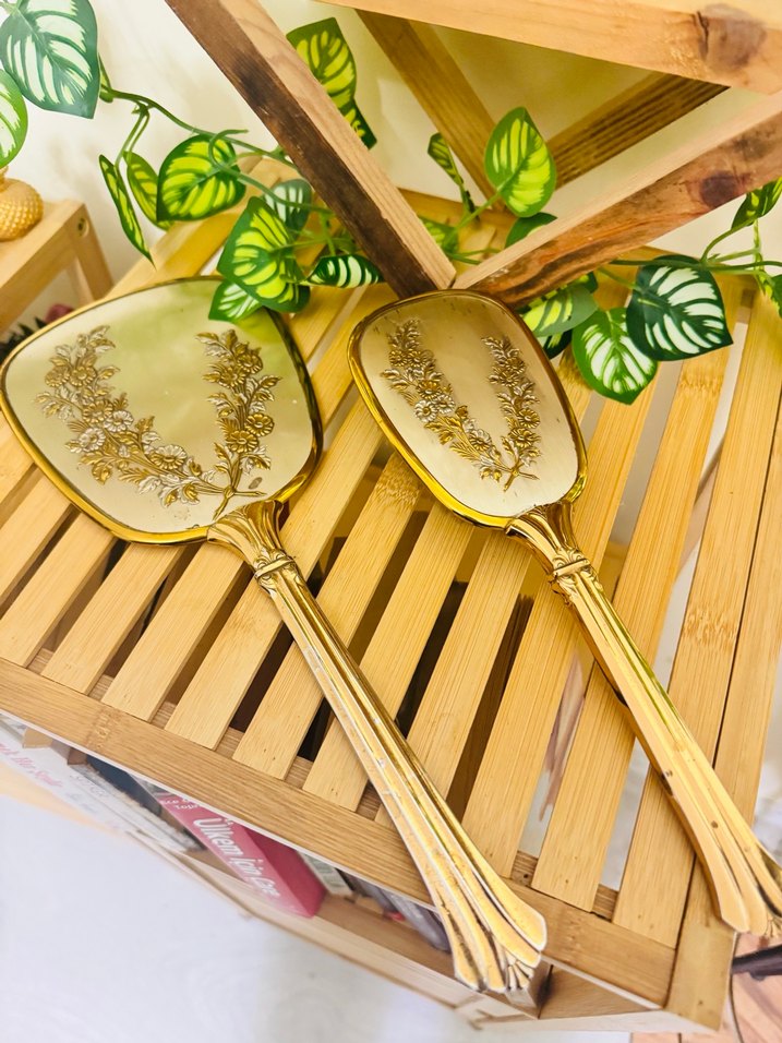 Parlak altın renkte, saplarında zarif çiçek desenleri bulunan makyaj fırçası seti.