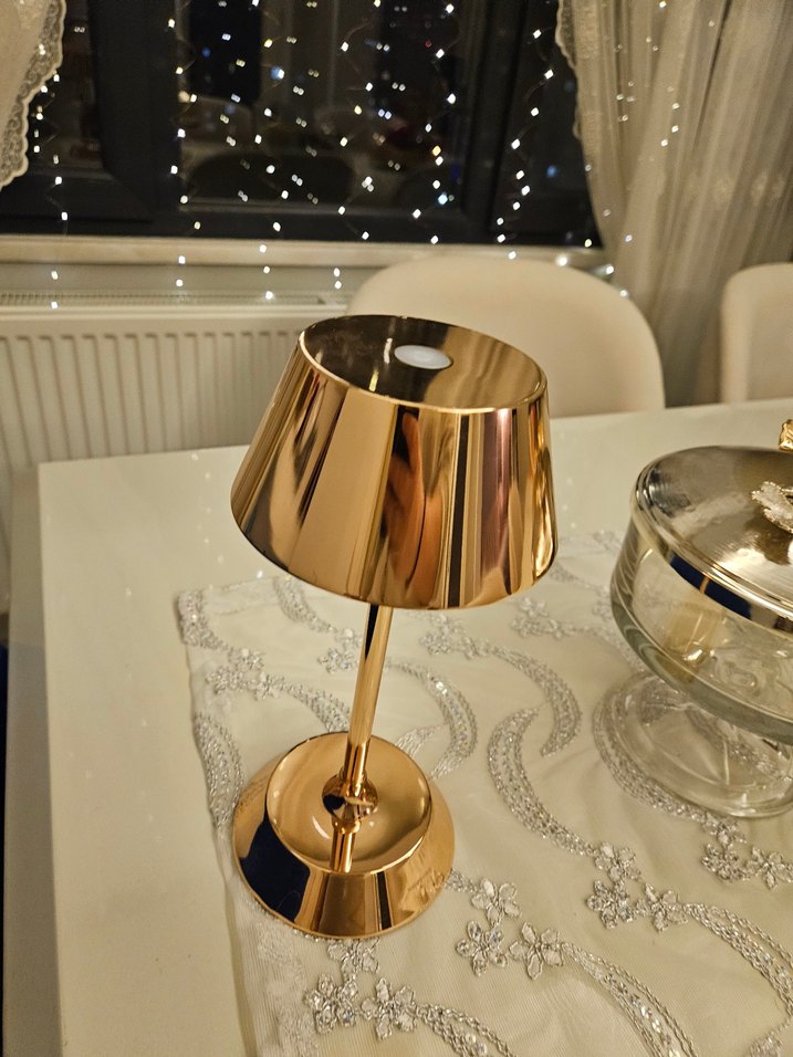 Parlak yüzeyli, şık ve modern tasarımlı altın masa lambası. Kompakt yapısıyla her ortama zarafet katar.