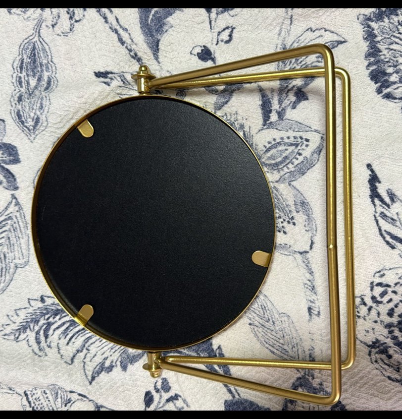Parlak altın renkli, yuvarlak çerçeveli ve minimalist ayaklı masaüstü ayna.