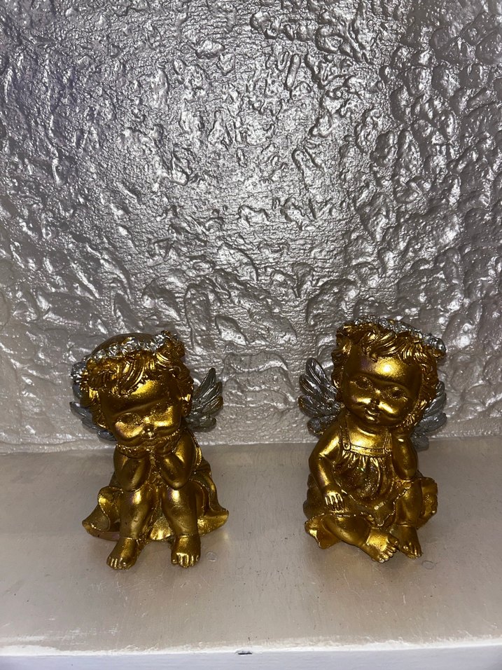 Parlak altın renkte, detaylı kanatlara sahip iki melek biblo seti. Dekorasyon için uygundur.