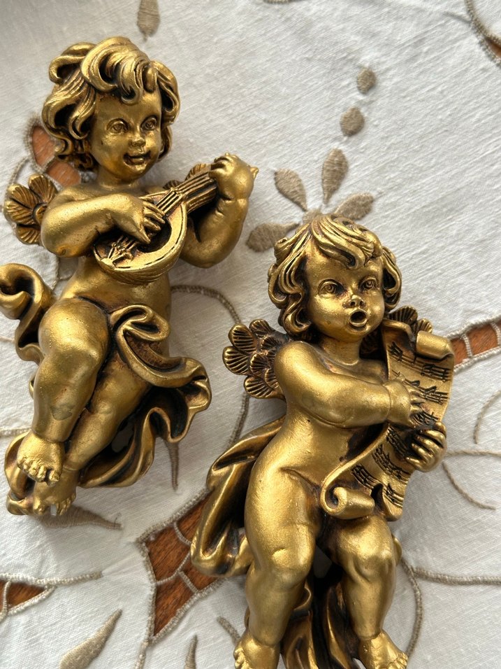 Parlak altın renkli, gitar ve parşömen tutan melek figürleri, ince detaylara sahip.