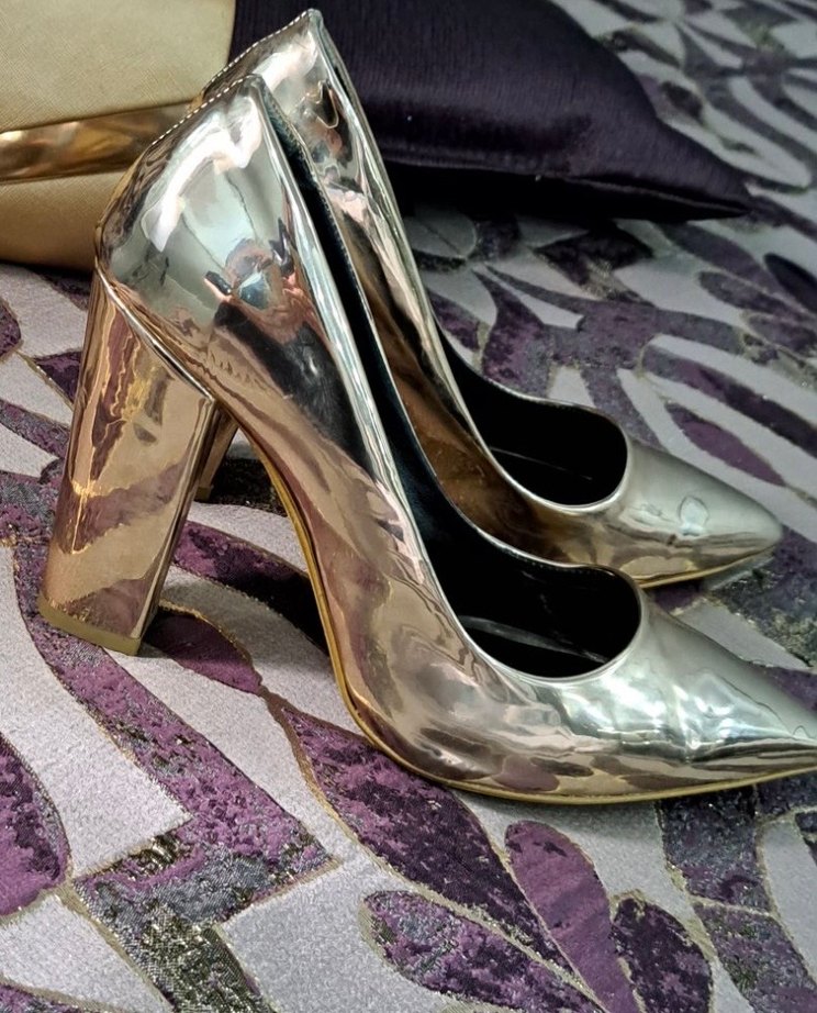 Parlak rugan dokusuna sahip altın metalik stiletto, blok topuklu ve cesur, çağdaş tarz için uygun. ✨hıc bır sorunu yok rengi altın rose rengi