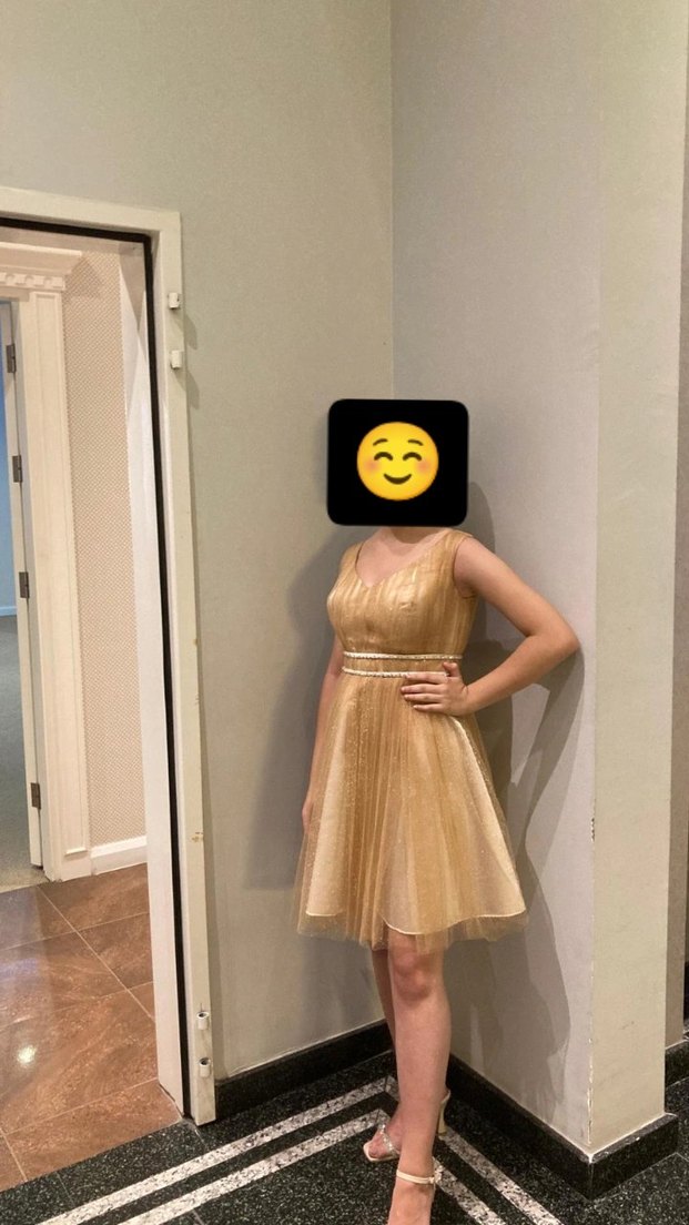 Parlak kumaştan yapılmış, kemerli ve V yakalı, ince askılı, vücuda oturan altın midi elbise, parti için avant-garde tarzda. sadece bir kere giyildi parlak kumaşı ile özel tasarlandı.