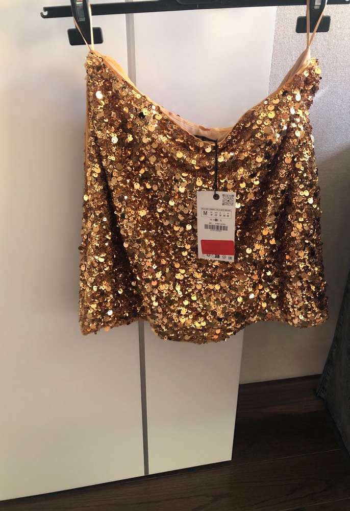 Parlak altın renkli, simli mini etek. Dar kesim ve kısa boyuyla parti ve sokak stili için uygundur. ✨