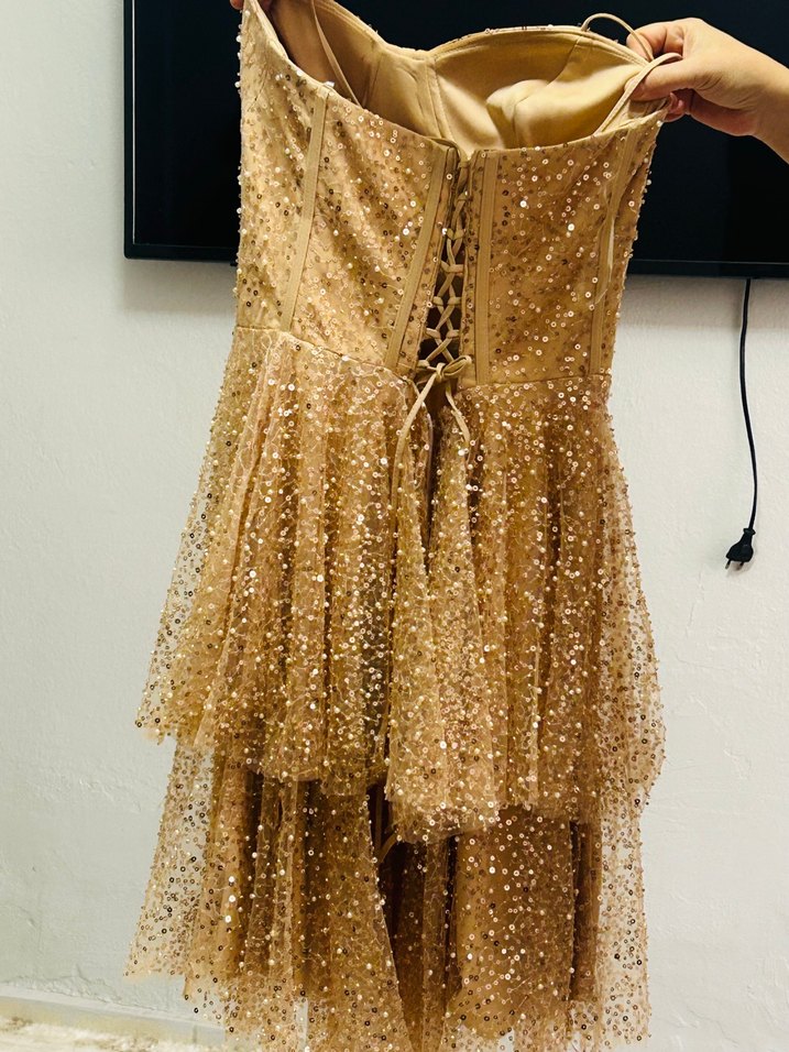 Parlak altın işlemeli, straplez ve mini boyda bu abiye elbise, katmanlı fırfır detaylarıyla dikkat çekiyor. Bohem tarzıyla şık ve trend bir seçim. ✨