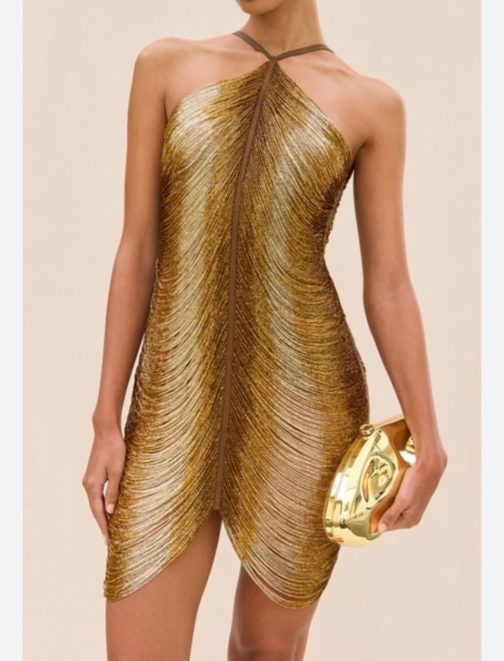 Parlak Altın Mini Yılan Desenli Drapeli Elbise