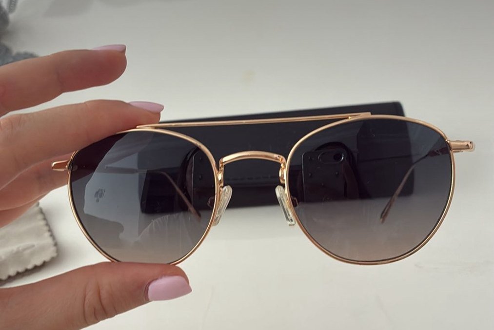 Parlak altın renkli çerçeveye sahip, modern klasik tasarımlı kadın güneş gözlüğü. Zamansız Paris şıklığı için zahmetsiz şıklık sunar.