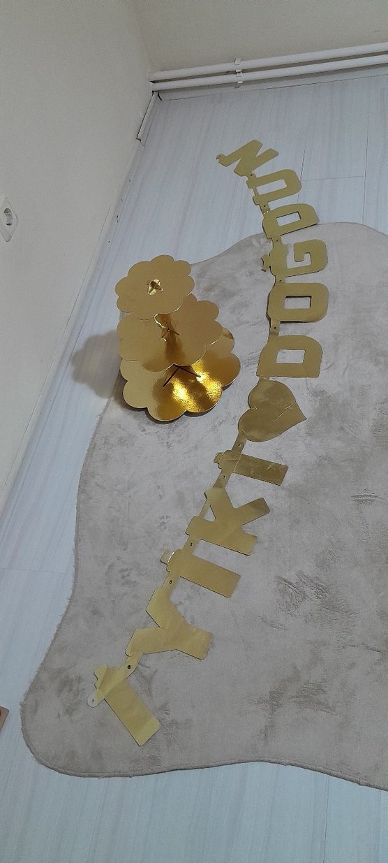 Parlak altın renkte, çiçek standı ve kalp figürlü harfli süsleme ipi içeren parti malzemeleri. 2 kez kullanildi