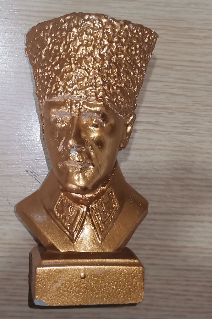 Parlak altın renkte, detaylı Atatürk büstü figürü. Dokulu şapka ve üniforma ile tasarlanmış, sağlam kaide üzerinde duruyor. ️