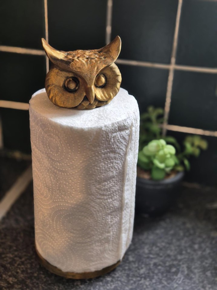 Parlak altın renkli baykuş figürünün süslediği kağıt havlu tutucu, hem işlevsel hem dekoratif bir üründür. İstediğiniz renk yapılabilir