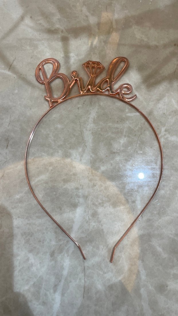 Parlak altın renkte metal taç, minimal ve bohem tarzda 'Bride' yazısı içerir, retro ve hippie görünüme uygundur.