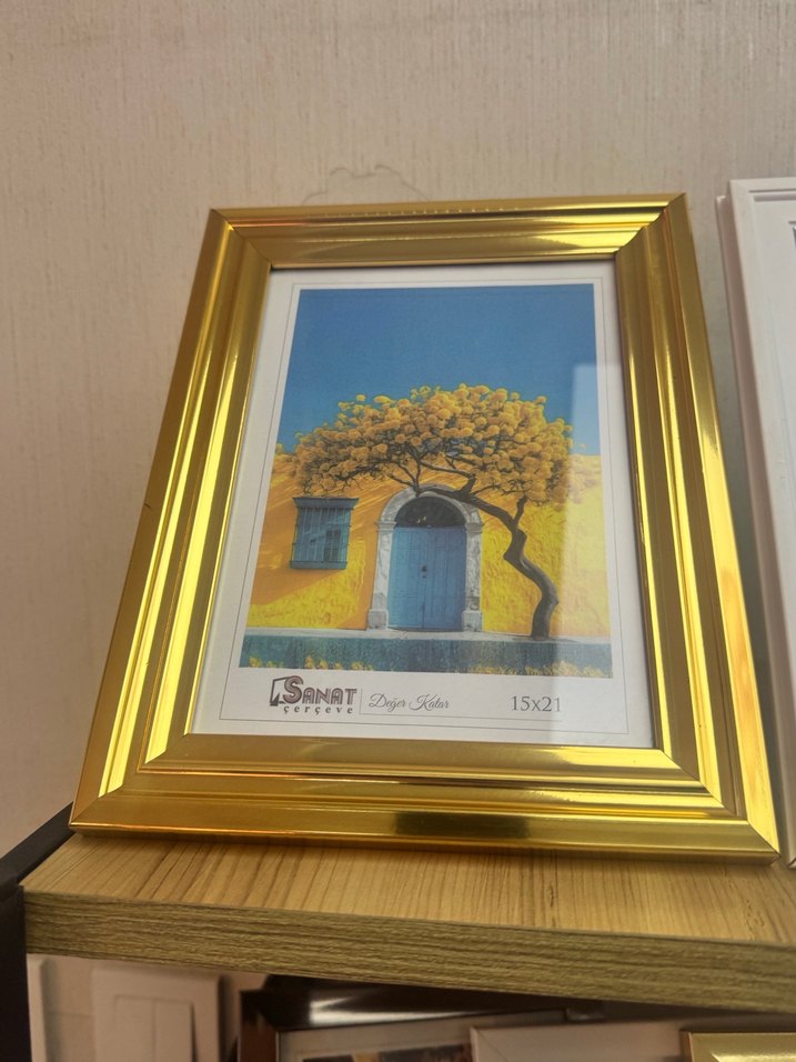 15x21 cm ölçüsünde parlak altın renkli, klasik tasarımlı çerçeve. Fotoğraf veya sanat eserleri için uygundur.