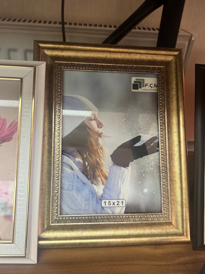 Parlak altın renkli, 15x21 cm ölçüsünde klasik tasarımlı dekoratif kenarlıklı çerçeve. Fotoğraf veya sanat eseri için uygundur. ️