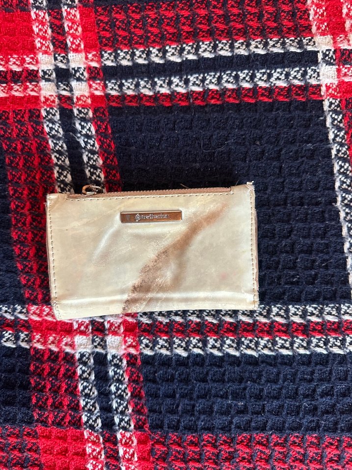 Parlak altın renkli, fermuarlı sentetik kumaş kadın cüzdanı. Kompakt bohem tarzda, günlük kullanıma uygun.