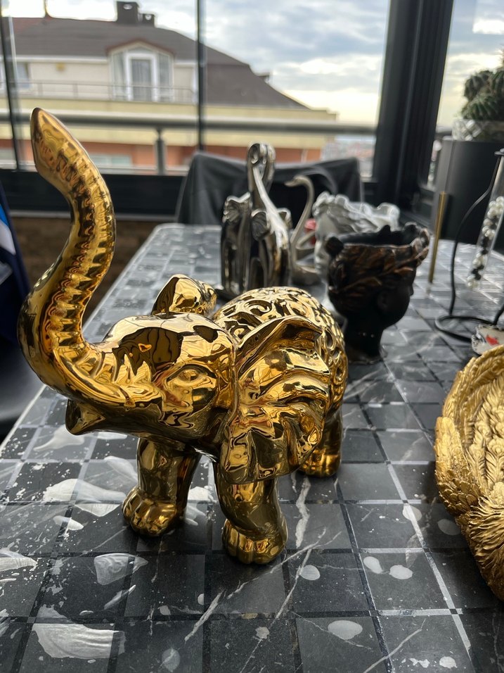 Parlak altın renkte, yükseltilmiş hortumlu fil figürü, dekoratif bir dokunuş sağlar.