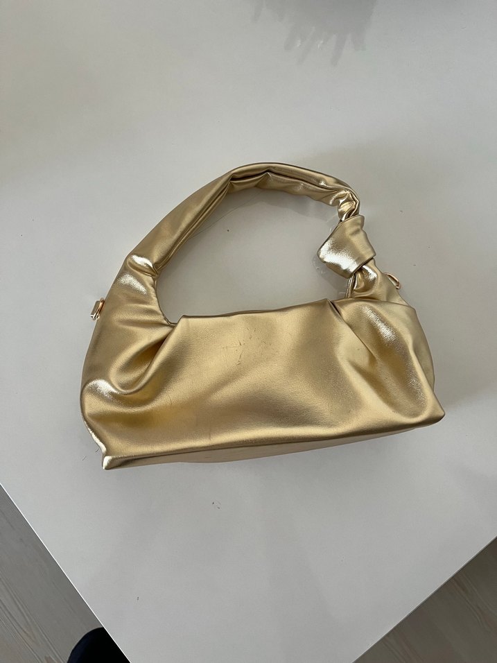 Parlak altın renkli deri çanta, tokalı askısı ve minimalist, çağdaş tasarımıyla günlük kullanıma uygundur. ✨