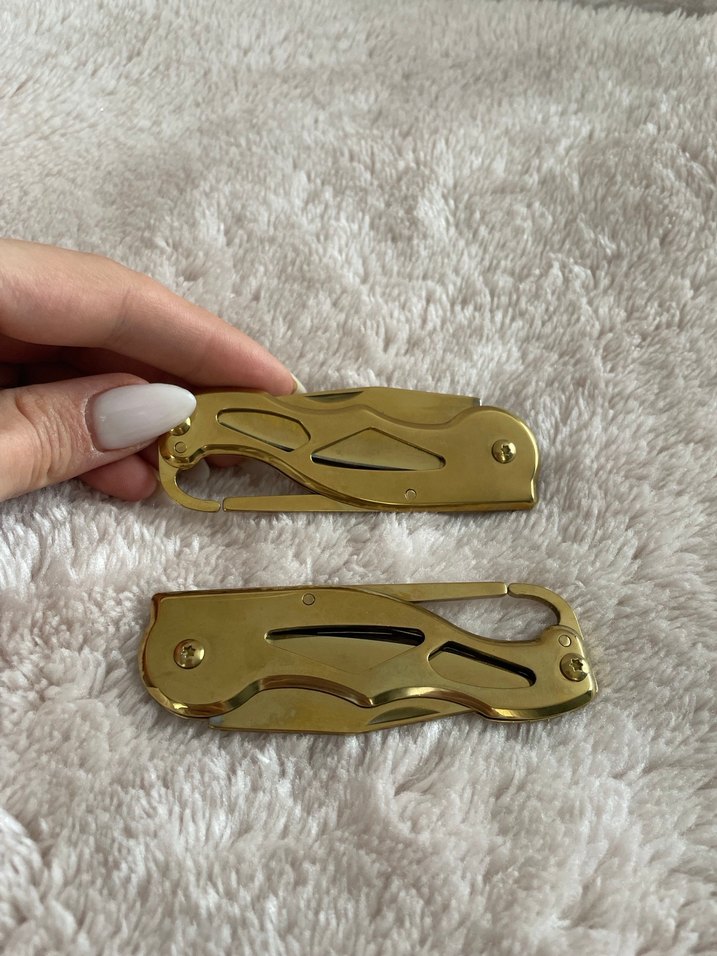 Parlak altın renkte, şık kesme deliklerine sahip katlanabilir çakılar, kompakt ve taşınabilir.