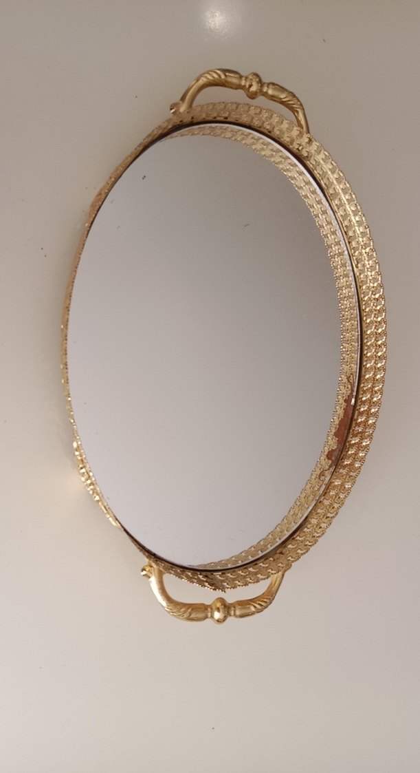 Kenarlarında dokulu desen bulunan, parlak altın renk çerçeve ve kulplu oval aynali sunum tepsisi bir parmak kadar kararması var resimde gösterilmiştir !✨34cm