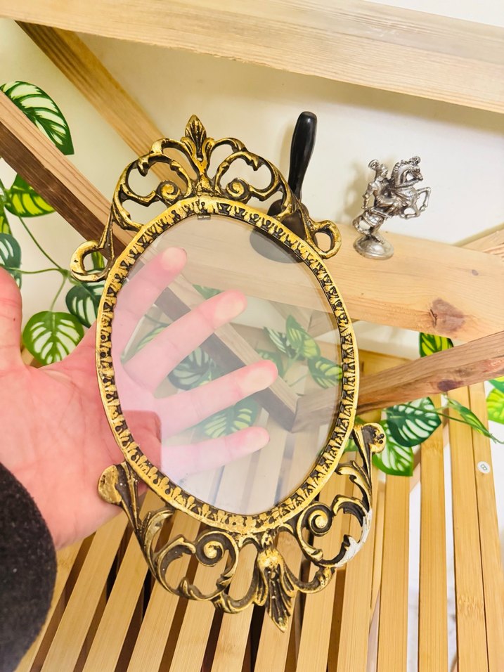 Parlak altın renkte oval şekilli, detaylı desenlere sahip dekoratif çerçeve. ️ ANTİKA PİRİNÇ ayna çerçevesi ALDIM #antika #antik #nostalji