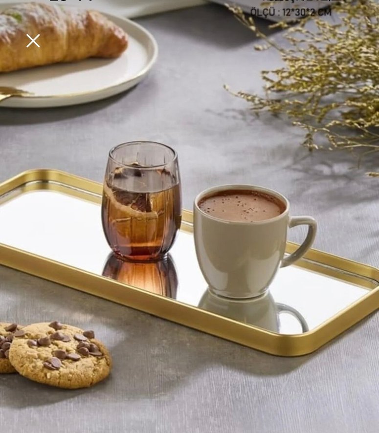 12x30 cm ölçüsünde parlak altın renk tepsi, içecek ve atıştırmalık servisinde kullanılır. Yansıtıcı yüzeyi ortamı şık gösterir. 1 Adet 150 2 Adet 250