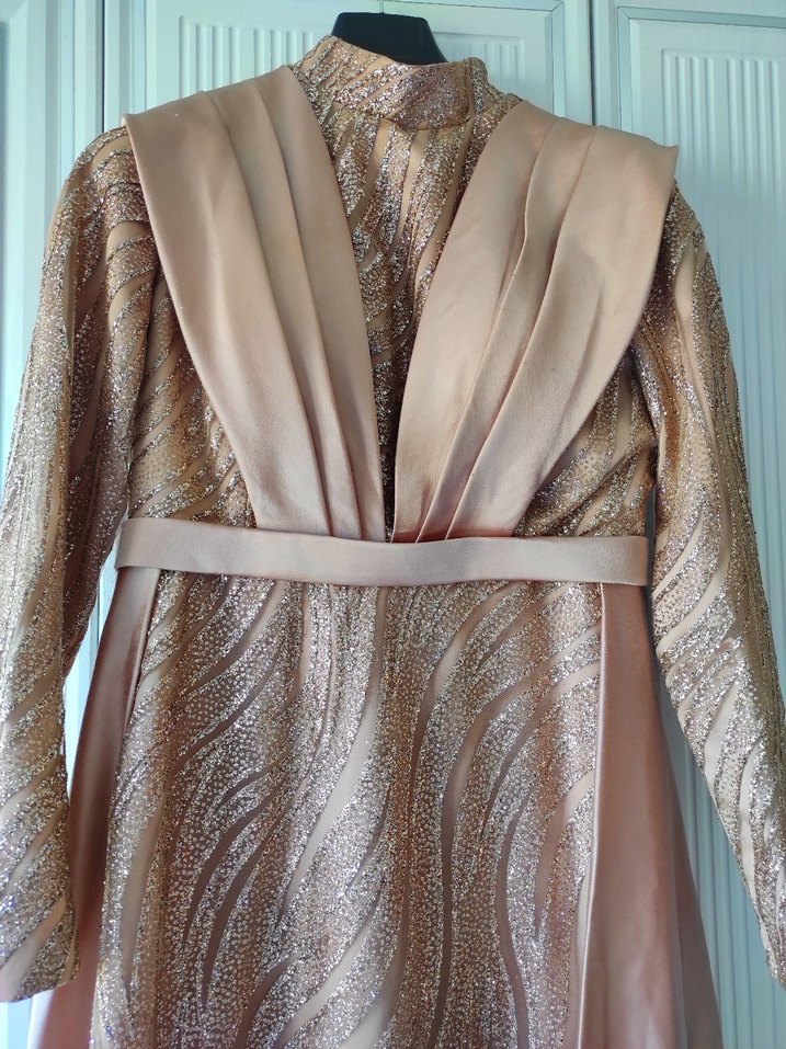 Parlak altın renkli, uzun kollu, drapeli ve desenli kumaştan yapılmış, klasik kesim uzun abiye elbise. Notch yaka detayı bulunur. ✨ şalı ile birlikte gönderim yapılacaktır. isteyene video atabilirim