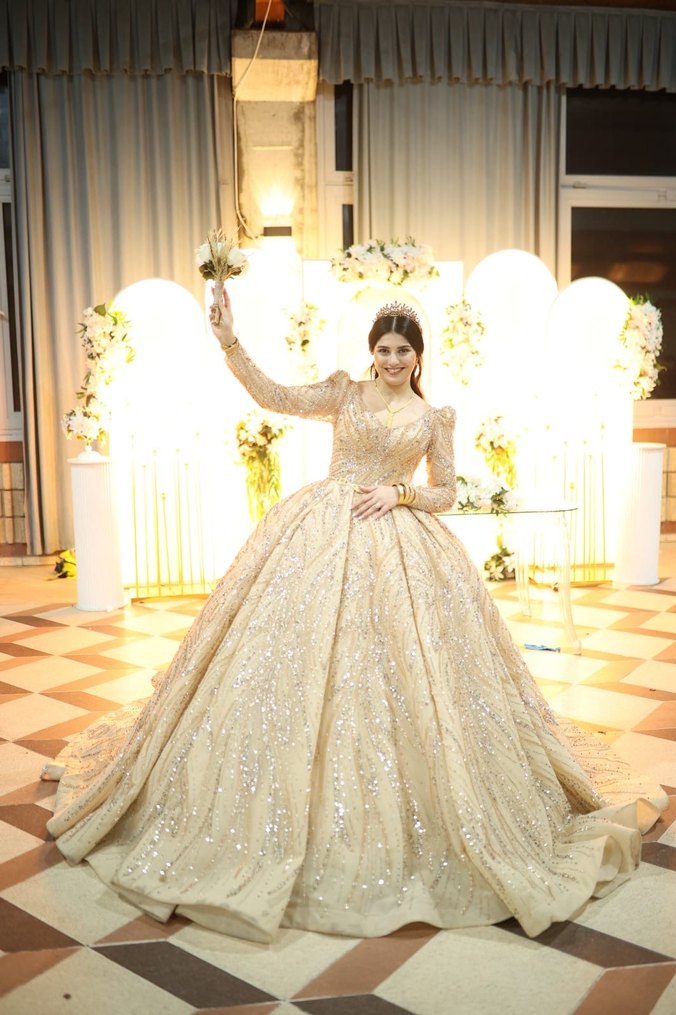 Parlak altın renkte, uzun kollu ve bol kesim prenses gelinlik, modern klasik tarzla göz alıcı bir şıklık sunar.