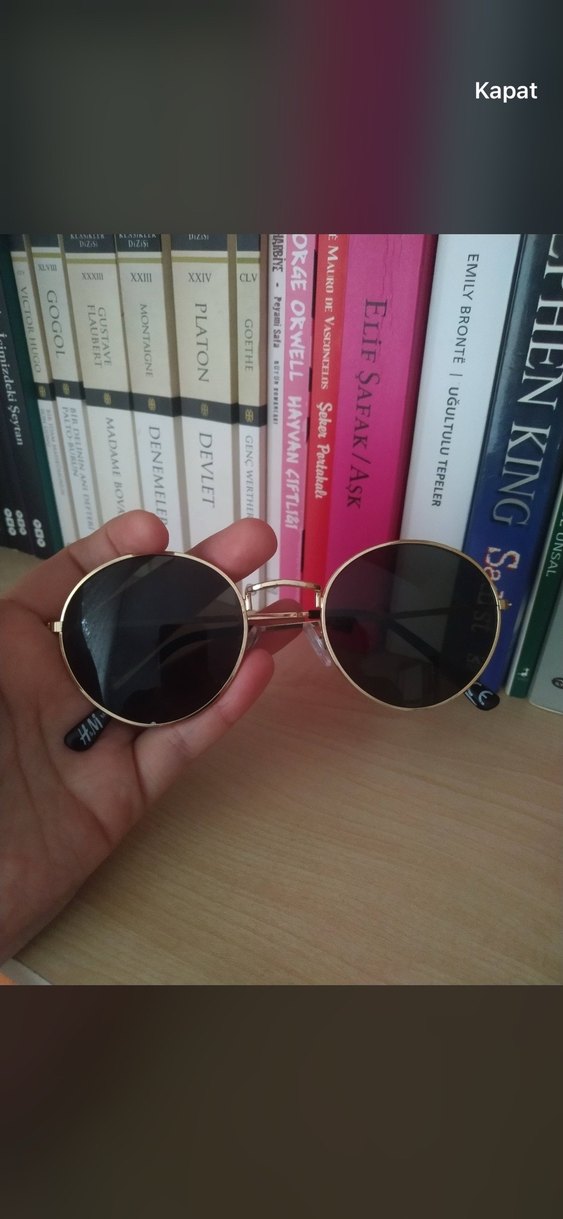 Parlak altın renkli yuvarlak kadın güneş gözlüğü, koyu renk camlarıyla bohem ve retro tarzını yansıtır. ️