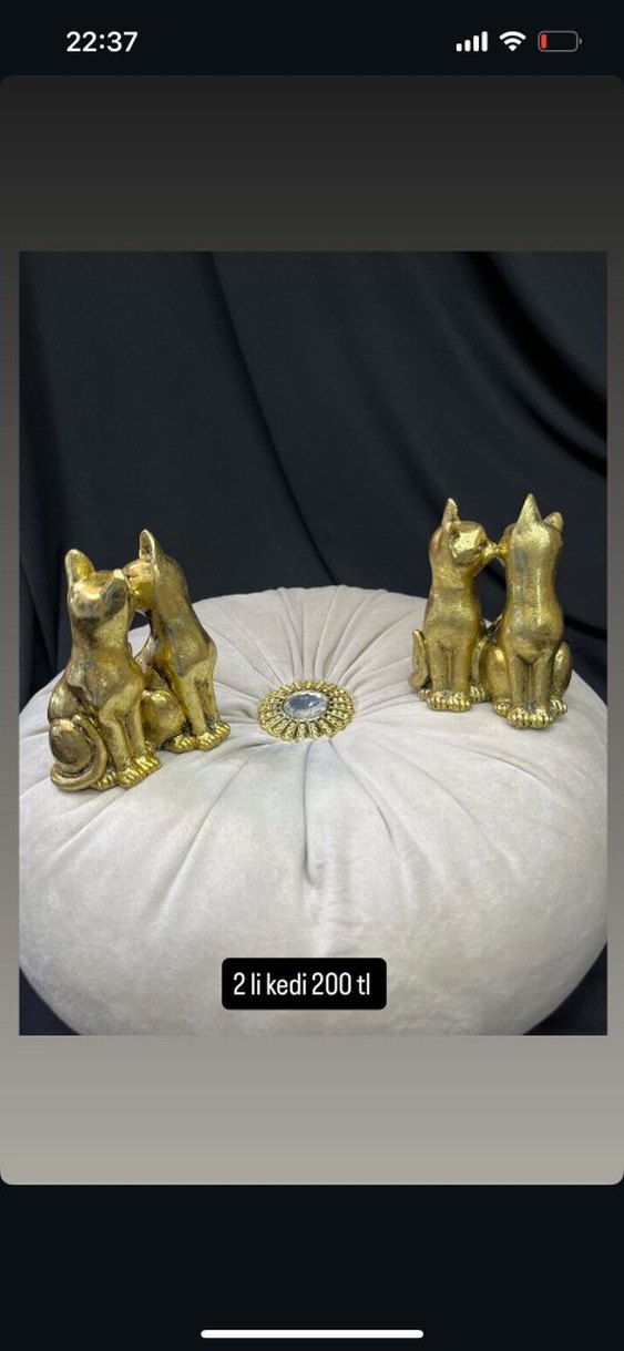 Parlak altın renkte, dekoratif amaçlı 2'li kedi figürleri seti. Her sette iki çift oturan kedi bulunur. teki 200