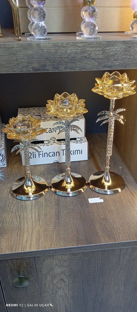 Çiçek şeklinde tasarlanmış, parlak altın renkli 3 adet mumluk seti, detaylı sap ve yuvarlak tabanlıdır.