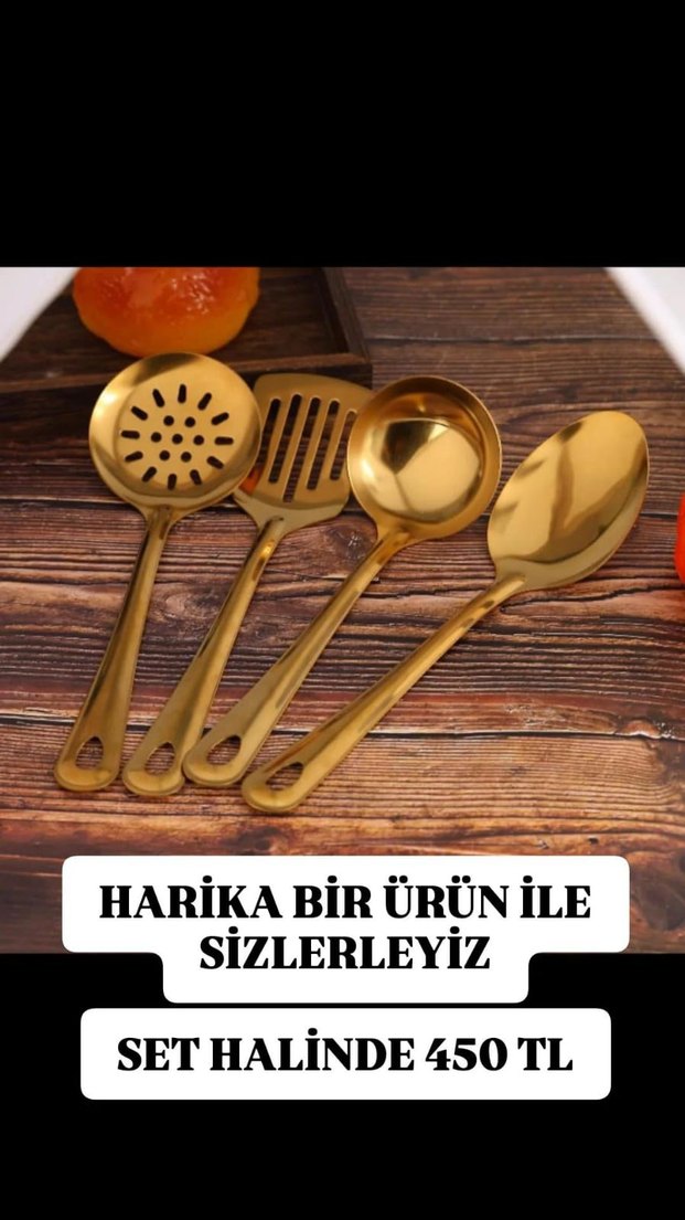 Parlak altın renginde, mutfakta kullanıma uygun 4 parçadan oluşan set. Set fiyatı 450 TL'dir.