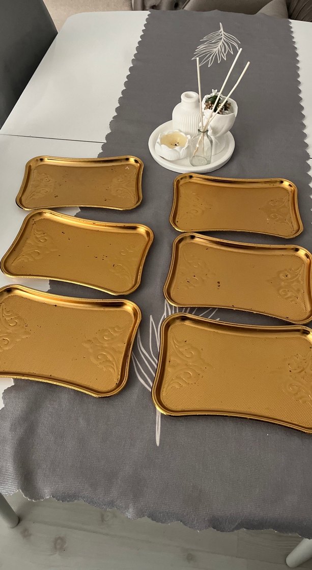 Parlak altın renginde, zarif kabartmalı detaylara sahip 6'lı dekoratif tepsi seti. Mutfakta servis veya sunum için uygun. ✨