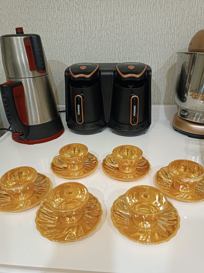 Parlak altın renkli, altı adet kahve fincanı ve tabaklardan oluşan set, ☕