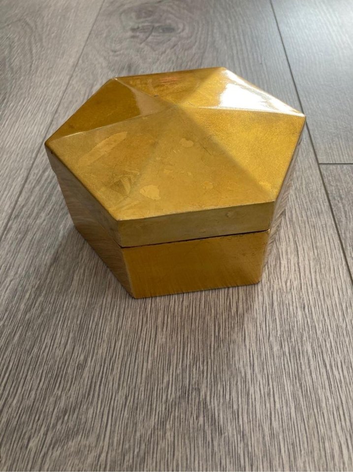 Parlak altın renkli, ahşaptan yapılmış takı kutusu, özel geometrik tasarıma sahiptir ve küçük eşyalar için uygundur. Takı kutusu #mucevher #takı #kutu #aksesuar #eskitme #retro #vintage sıkıntısı yoktur