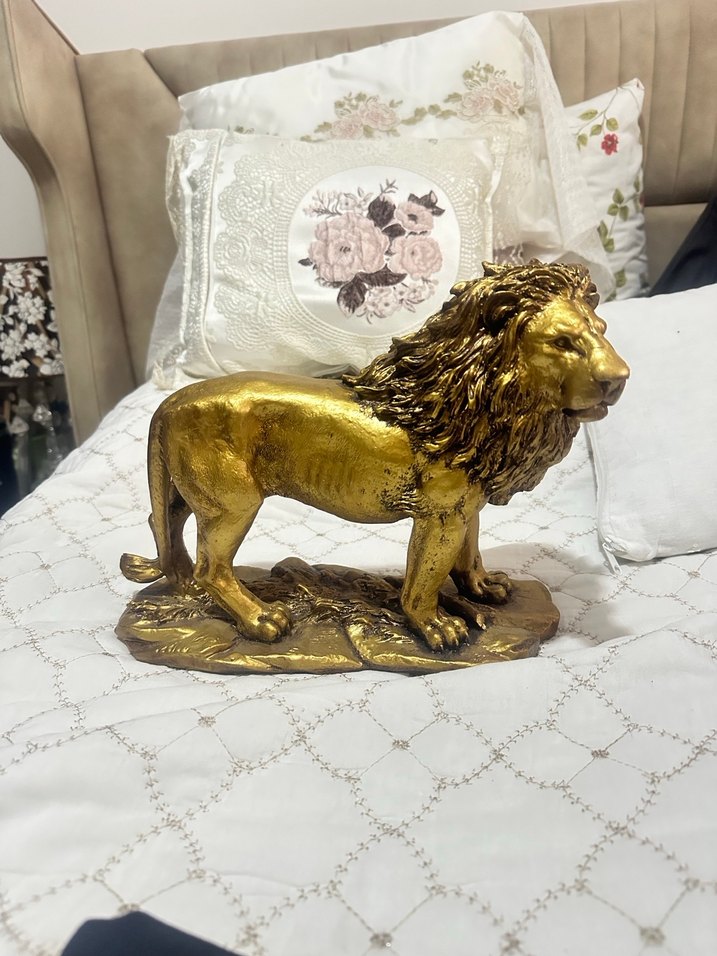 Parlak altın renkte aslan figürü, detaylı yele ve dokulu taban üzerinde duruyor. Her mekâna şıklık katıyor.