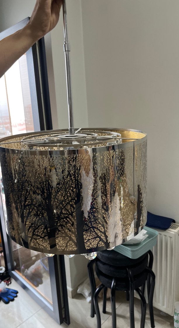 Parlak altın renkli abajur, ağaç desenli ve sarkıt kristal detaylıdır, mekana şıklık katar.