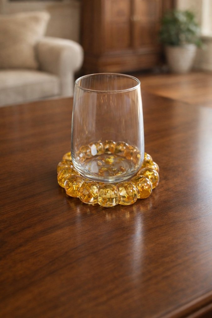 Parlak altın renkte, kabarcık şeklinde tasarlanmış cam bardak altlığı, masaları korumak için uygundur.