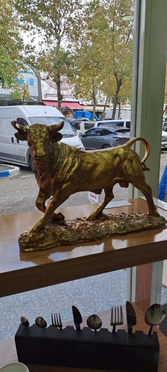 Detaylı kas ve formu yansıtan, dokulu taban üzerinde duran parlak altın renkli boğa figürü.