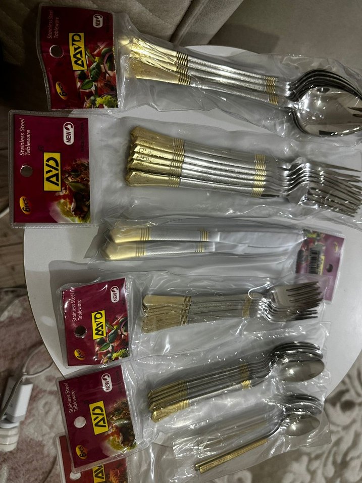 Parlak altın renkli sap detaylarına sahip çatal, kaşık ve bıçak seti. Şık sofralar için uygundur.