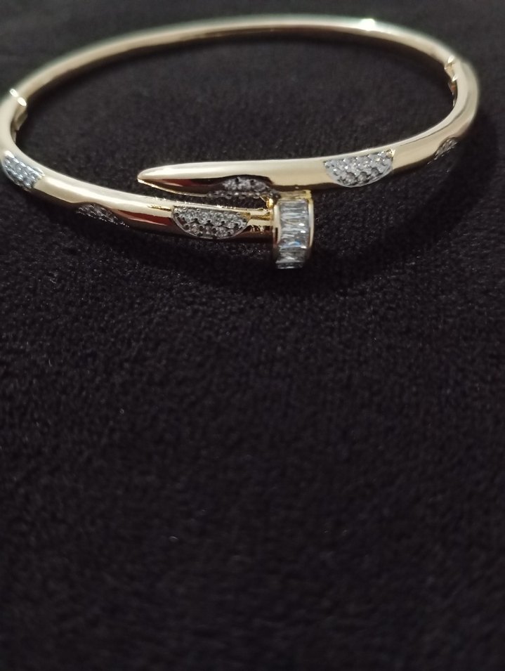 Parlak altın renkli, çivi desenli ve küçük taş detaylı, tokalı modern ve şık kadın bilekliği.
