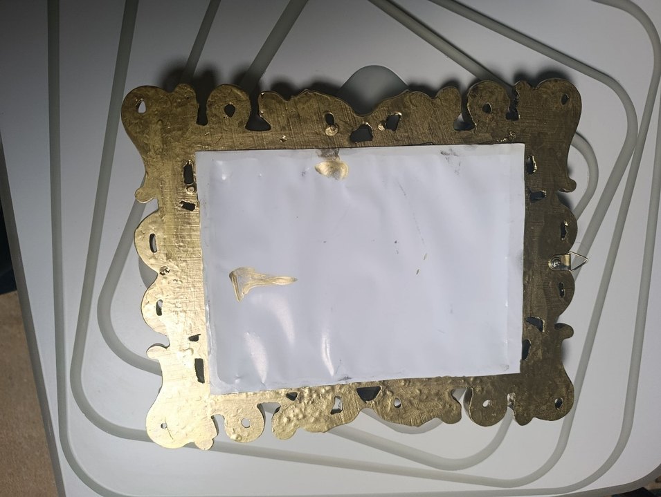 Parlak altın renkte, dekoratif ve oyma detaylı çerçeve. Dokulu yüzeyiyle vintage bir hava katıyor. Dikdörtgen beyaz bir alan içerir. ️