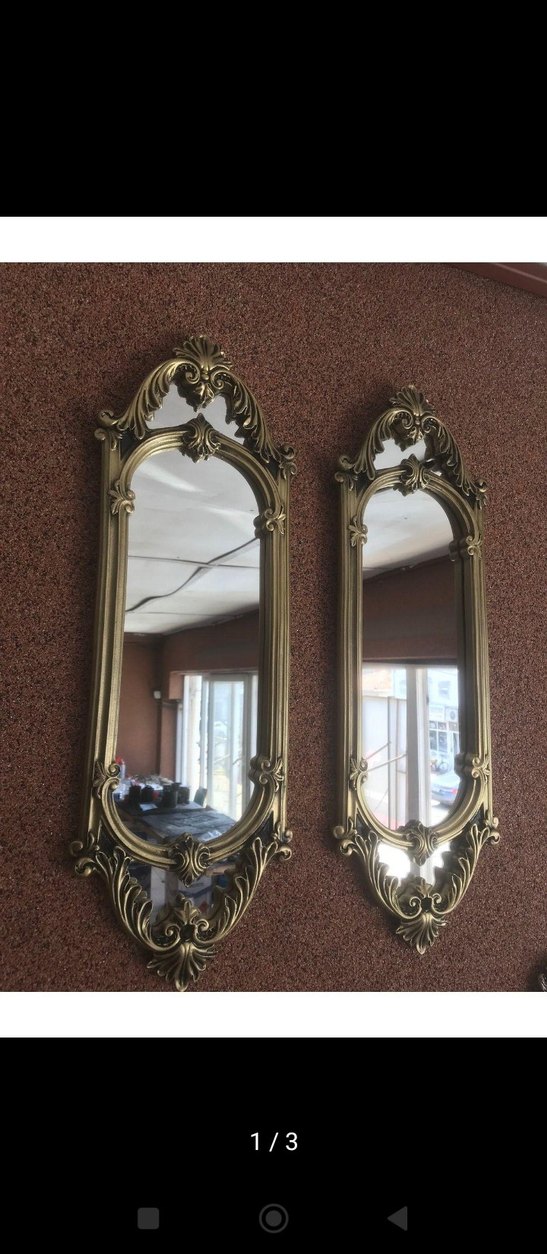 Parlak altın renkli, detaylı tasarıma sahip dekoratif duvar aynalarıdır. Her odaya şıklık katar. kaliteli , metal ,kullanilmadi