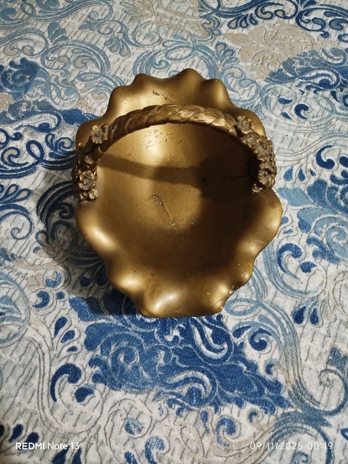 Parlak altın renkli, dalgalı kenarlı ve dekoratif saplı sepet. Küçük eşyalar için veya dekoratif amaçlı kullanılabilir.