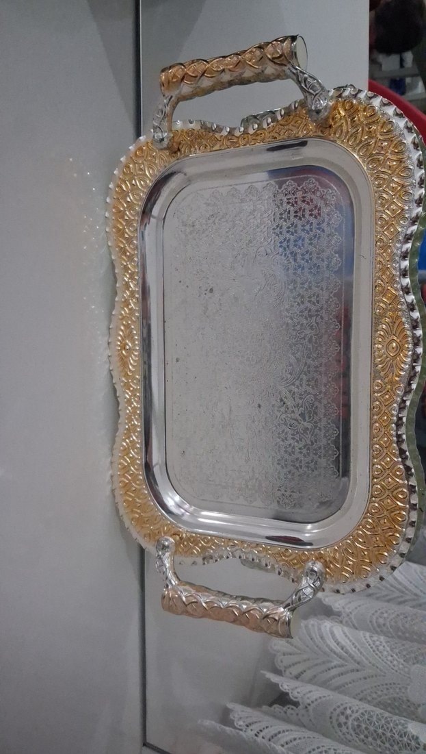 Parlak altın çerçevesi ve işlemeli desenleriyle dekoratif tepsi, taşıma kolaylığı sağlayan kulplara sahiptir. ✨