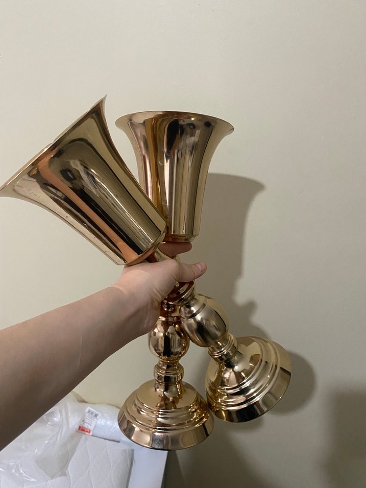 Parlak altın renkli, şık kıvrımlı tasarıma sahip dekoratif vazolar. Her mekana zarif bir dokunuş katmak için uygun. tekli fiyatıdır !